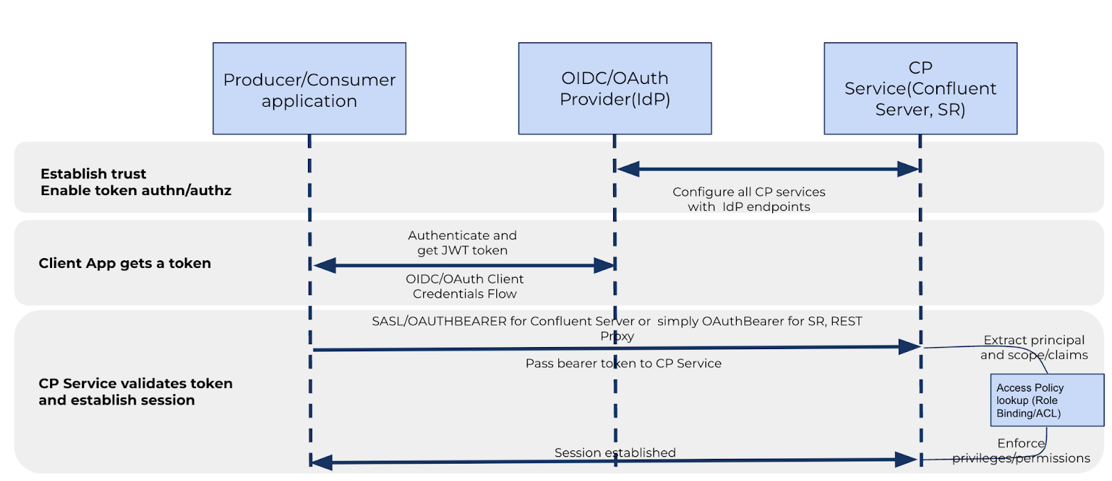 The same flow as described above (named the client credentials grant flow in the OpenID Connect specification and RFC 6749) is also triggered when OAuth/OIDC is enabled for authentication between clients (producers or consumers) and other Confluent Platform services, such as Schema Registry or REST Proxy. Also, when OAuth/OIDC is used for securing service to service communication between all Confluent Platform services, for example, between Schema Registry and Confluent Server brokers or between Confluent Server brokers to Schema Registry.