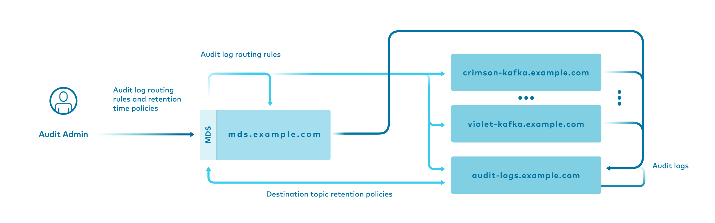 You can use Confluent CLI commands to dynamically update your audit log configurations. The Confluent CLI is the recommended tool for scripted or command line interactions with the MDS API Audit Log Configuration endpoints. Changes made using Confluent CLI are pushed from the MDS (metadata service) out to all registered clusters, allowing for centralized management of the audit log configuration.
