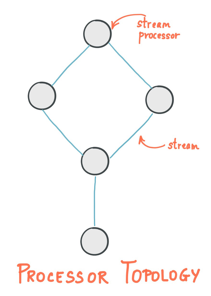 A processor topology or simply topology defines the computational logic of the data processing that needs to be performed by a stream processing application. A topology is a graph of stream processors (nodes) that are connected by streams (edges). Developers can define topologies either via the low-level Processor API or via the Kafka Streams DSL, which builds on top of the former.