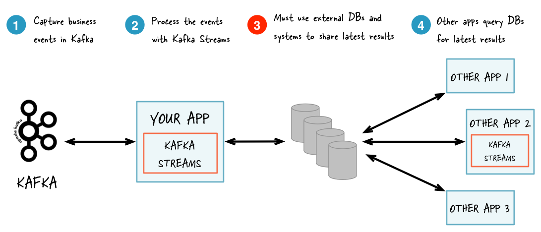 The following diagram juxtapose two architectures: the first does not use Interactive Queries whereas the second architecture does. It depends on the concrete use case to determine which of these architectures is a better fit – the important takeaway is that Kafka Streams and Interactive Queries give you the flexibility to pick and to compose the right one, rather than limiting you to just a single way.