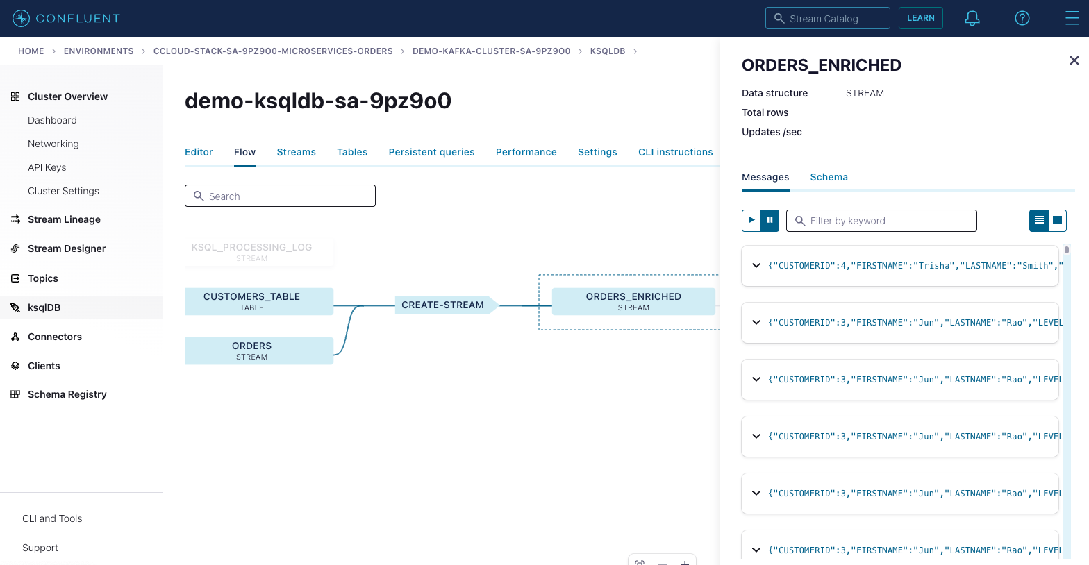 ORDERS_ENRICHEDstream to observe events occurring and examine the stream’s schema.