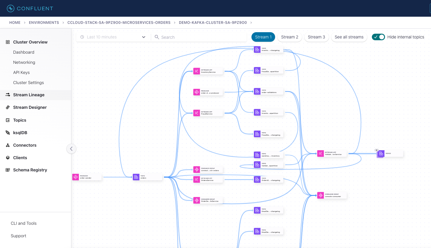 After starting the example, the microservices applications will be running locally and your Confluent Cloud instance will have Kafka topics with data in them.