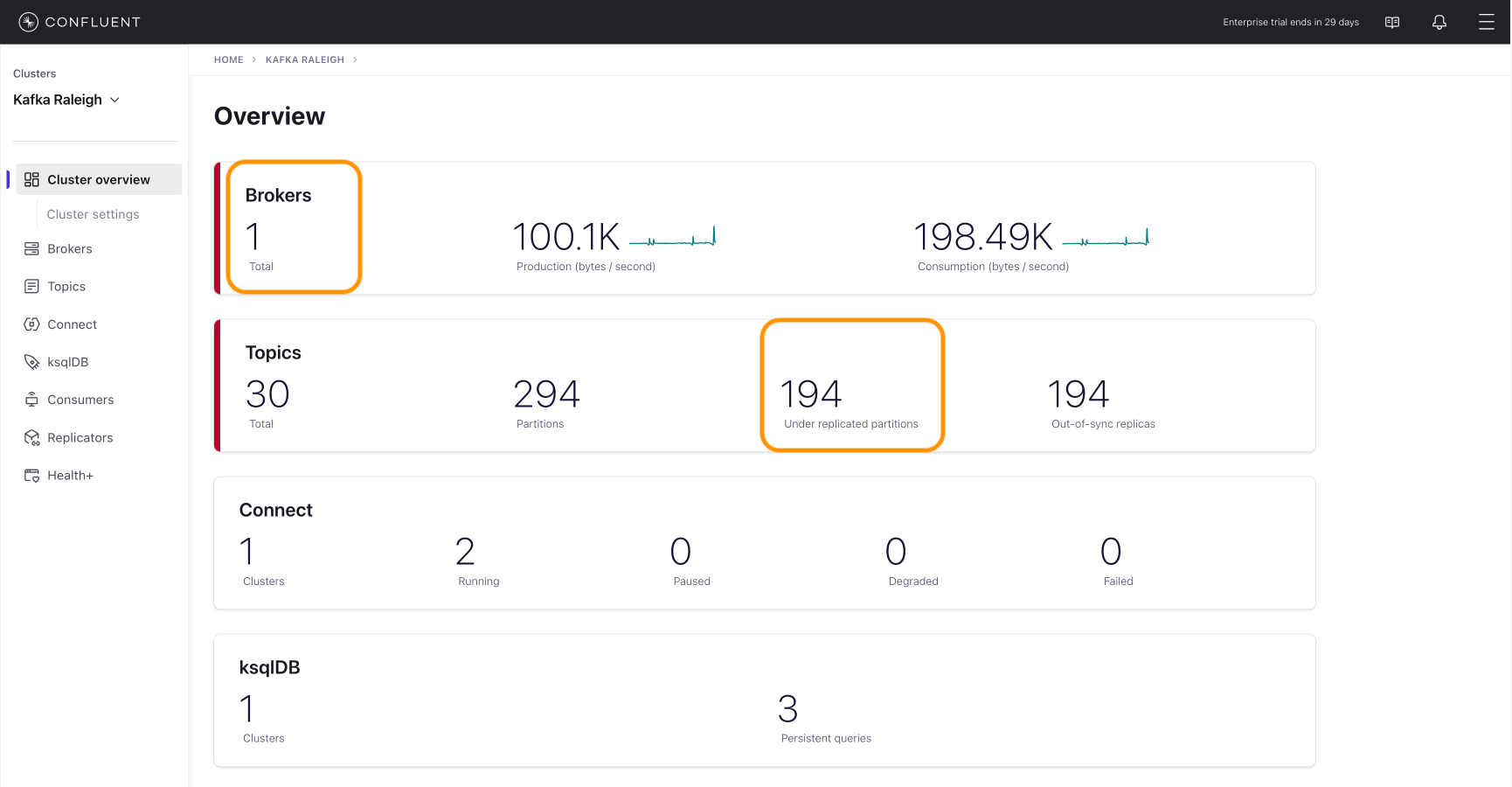 After a few minutes, observe the Broker summary show that the number of brokers has decreased from 2 to 1, and there are many under replicated partitions.