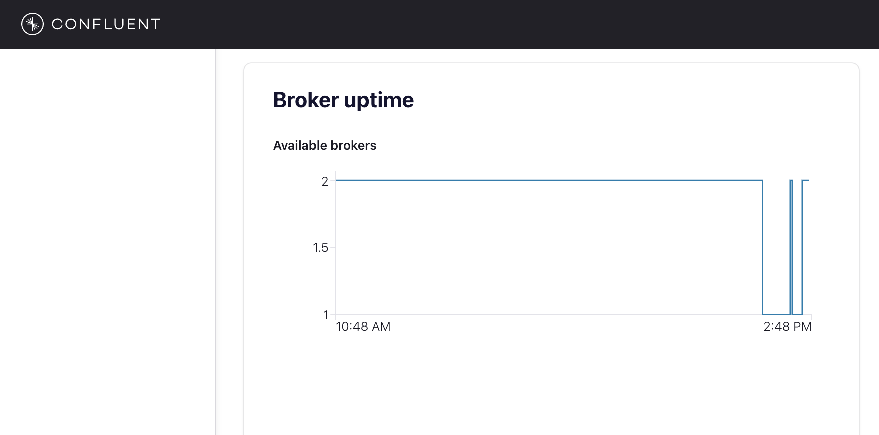 After about a minute, observe the broker summary in Confluent Control Center. The broker count has recovered to 2, and the topic partitions are back to reporting no under replicated partitions.