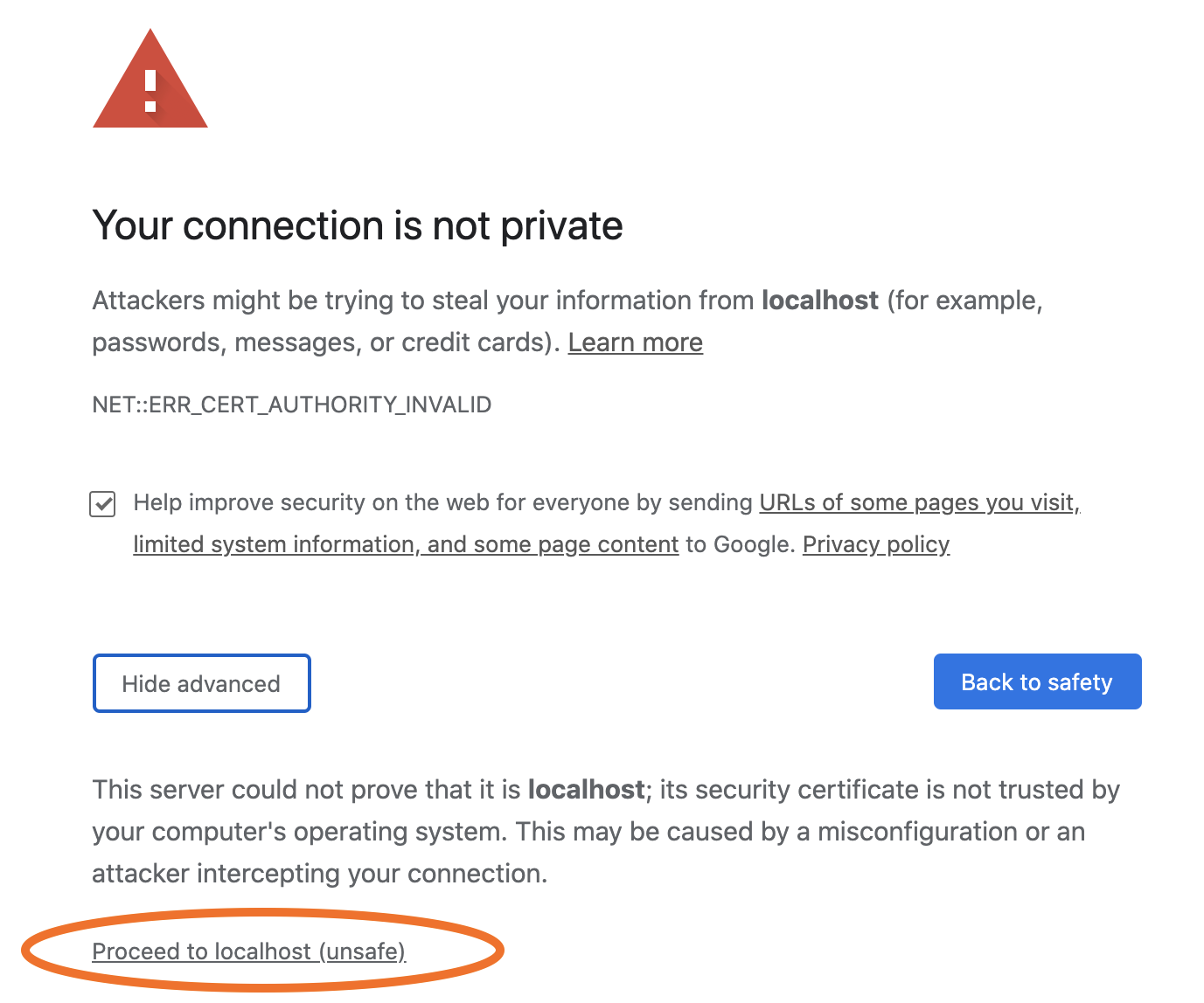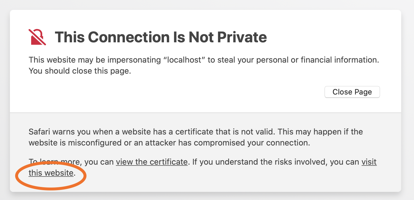 The browser will detect a self-signed, untrusted certificate and certificate authority, and issue a privacy warning as shown below. To proceed, accept this certificate using your browser’s process for this, which will then last for the duration of that browser session.