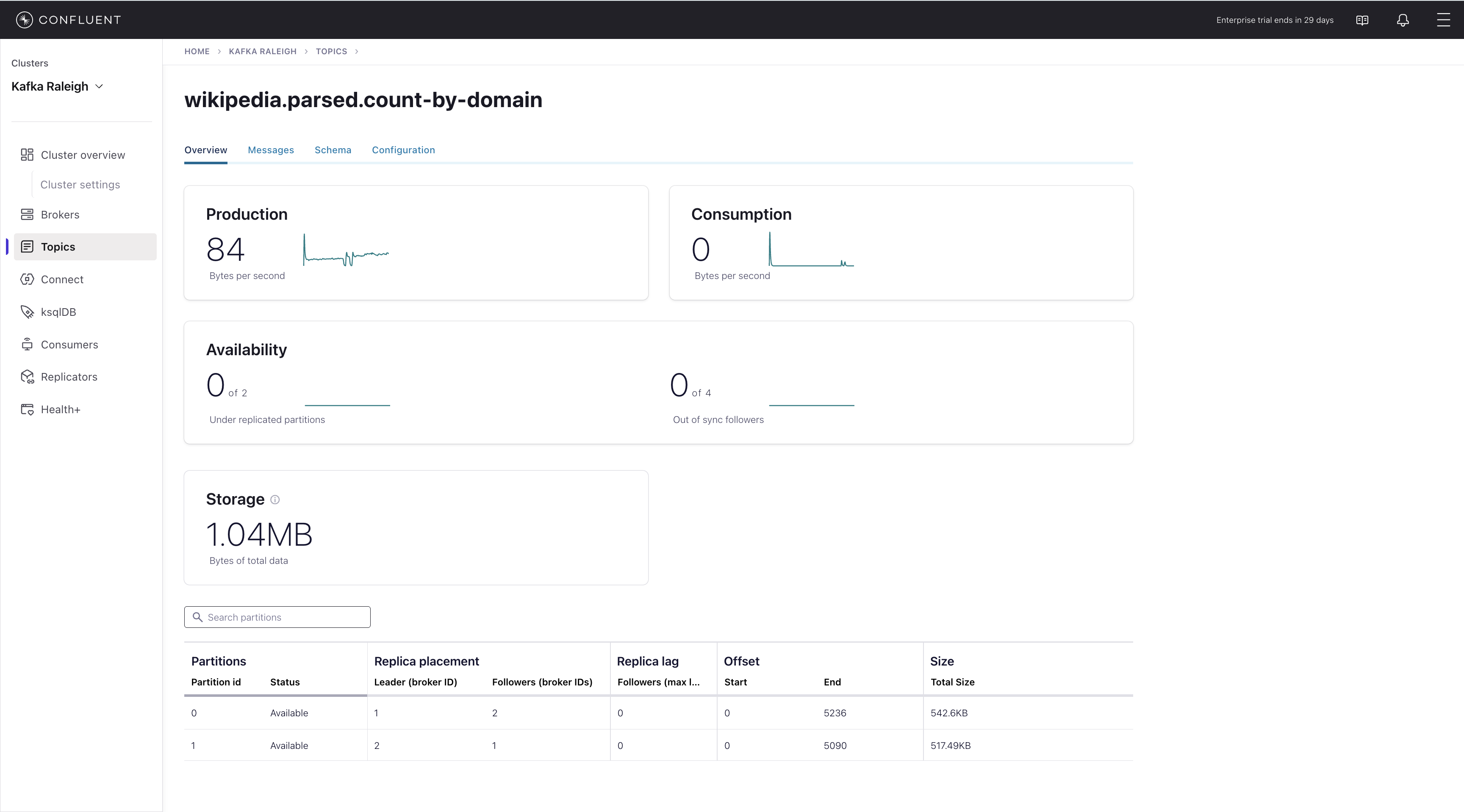 Partition replicas: Partitions, leaders, under replicated partitions, and under min in-sync replicas.