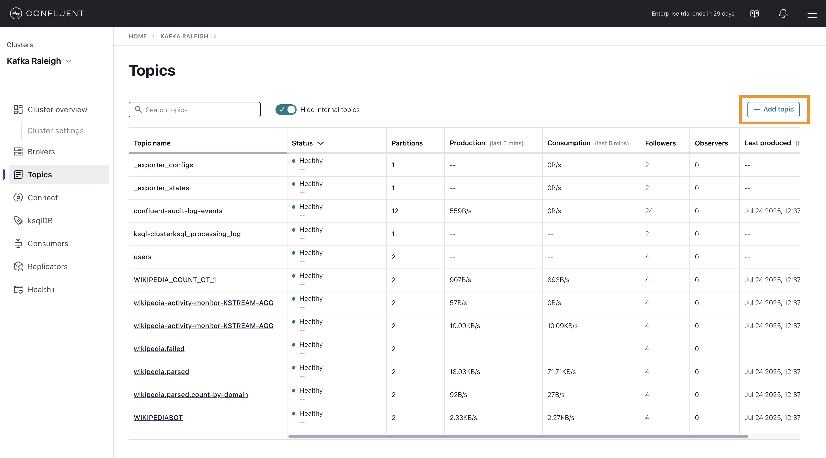 Return to Topics view and click the + Add a topic button to create a new topic in your Kafka cluster. You can also view and edit settings of Kafka topics in the cluster. Read more on Confluent Control Center topic management.