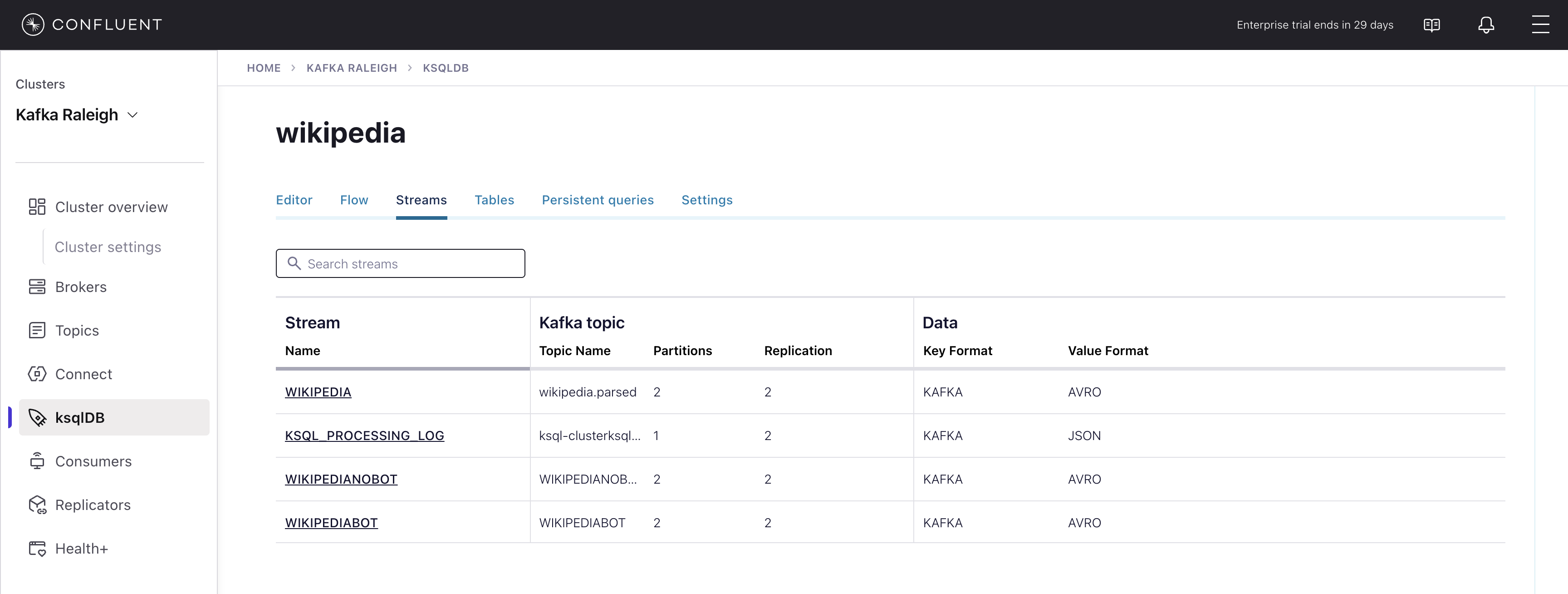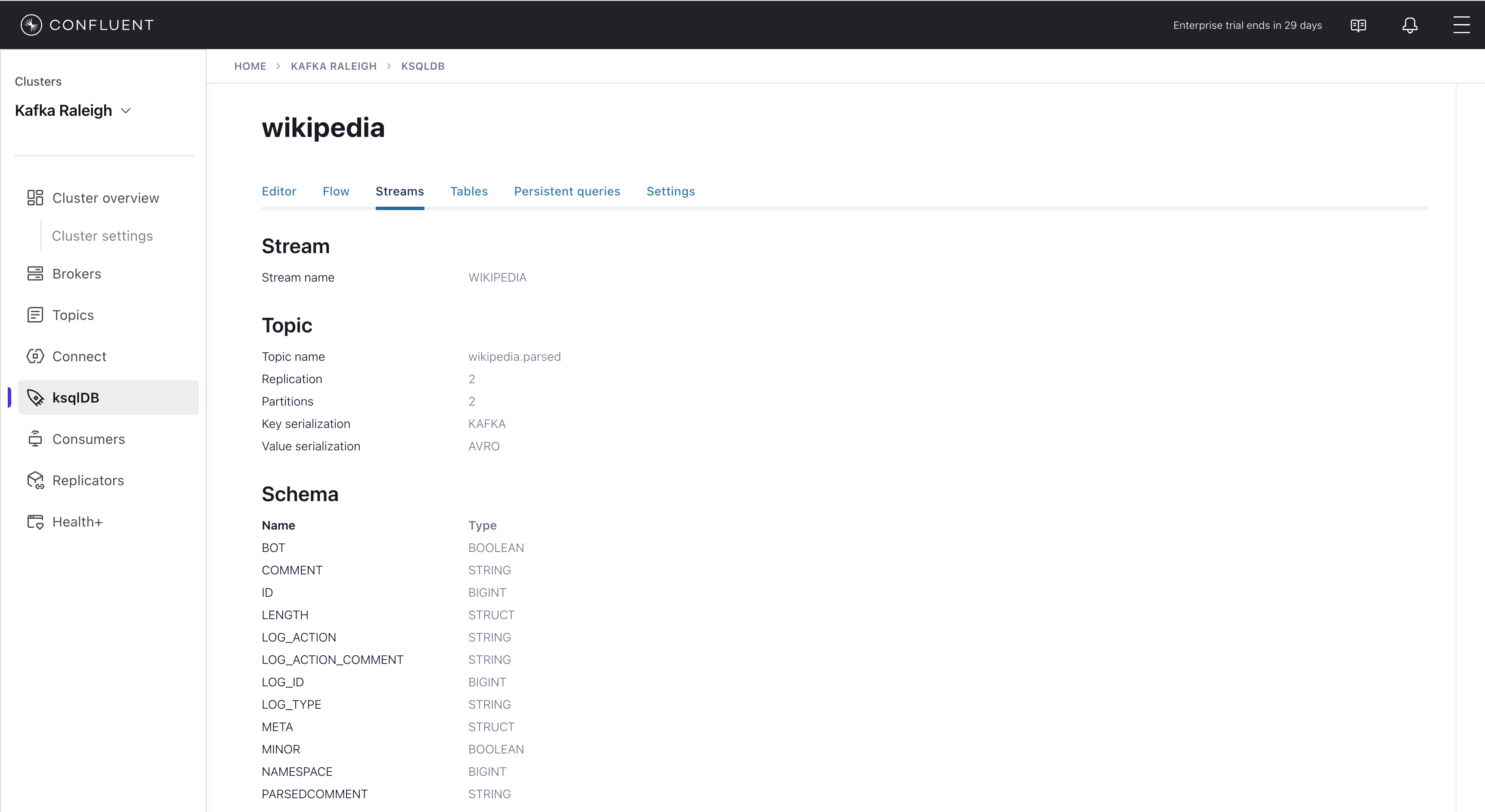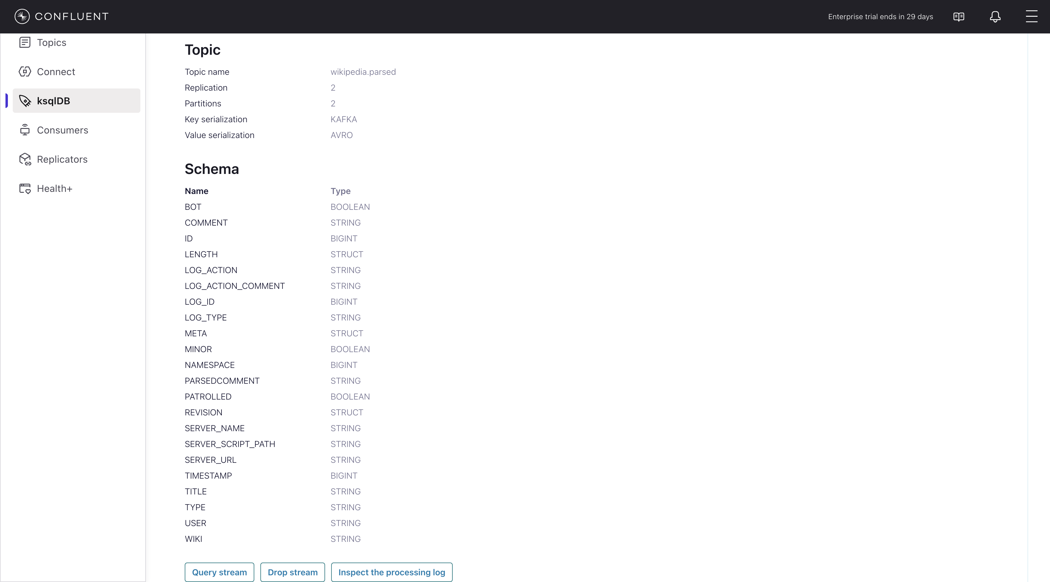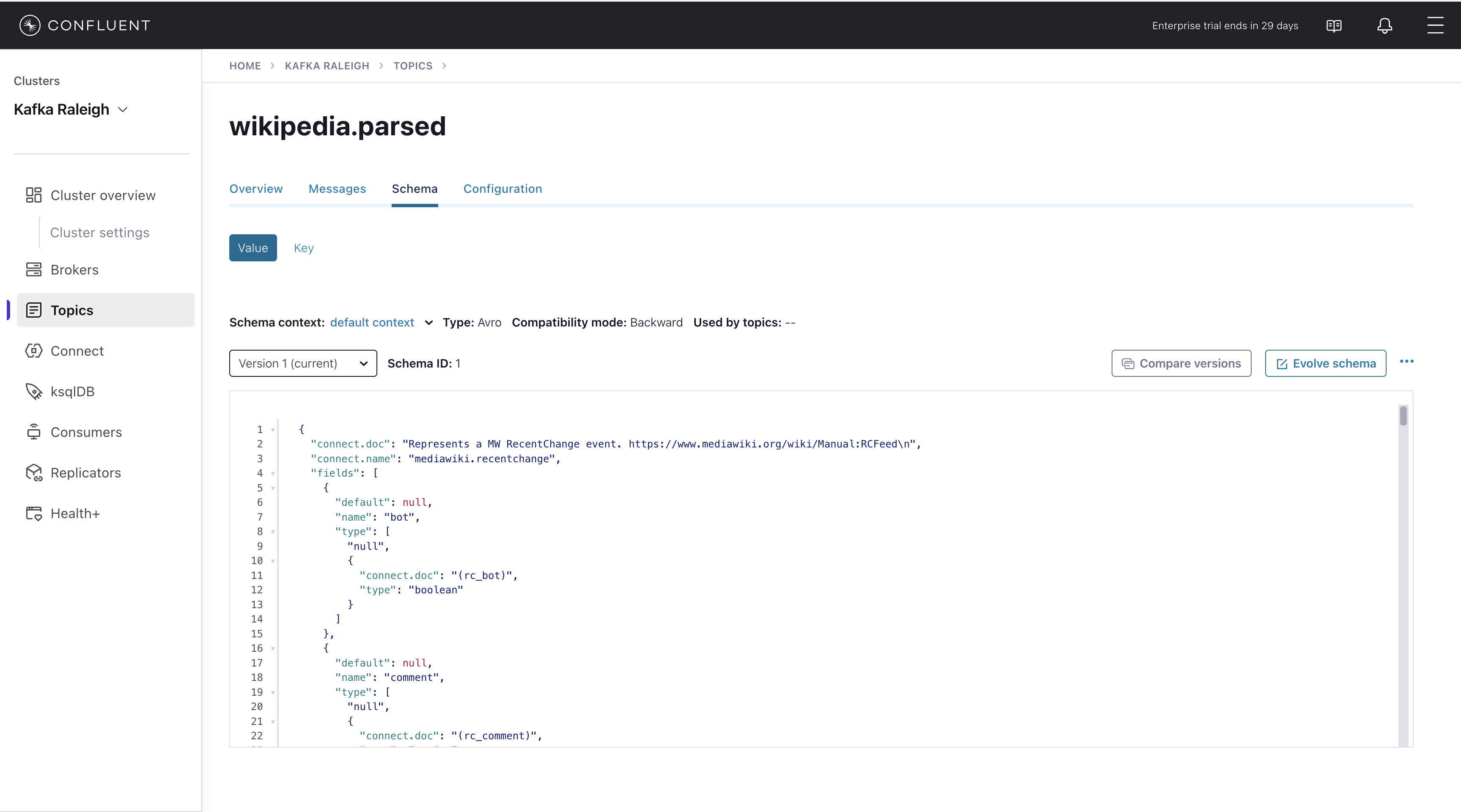 wikipedia.parsed, the topic value is using a Schema registered with Schema Registry (the topic key is just a string).
