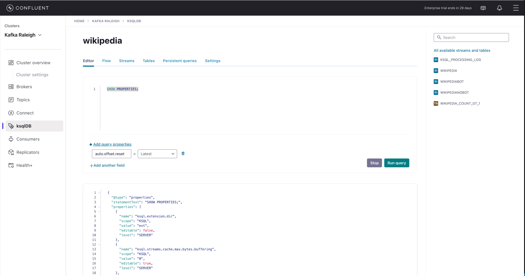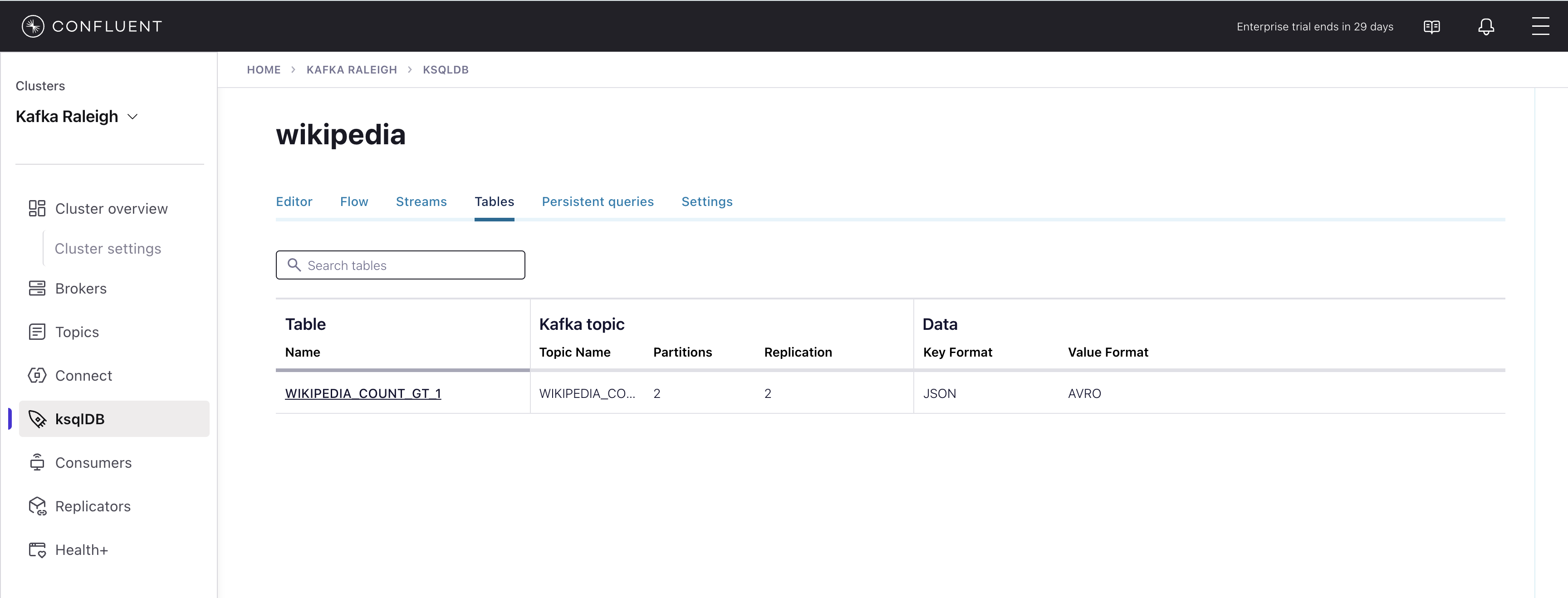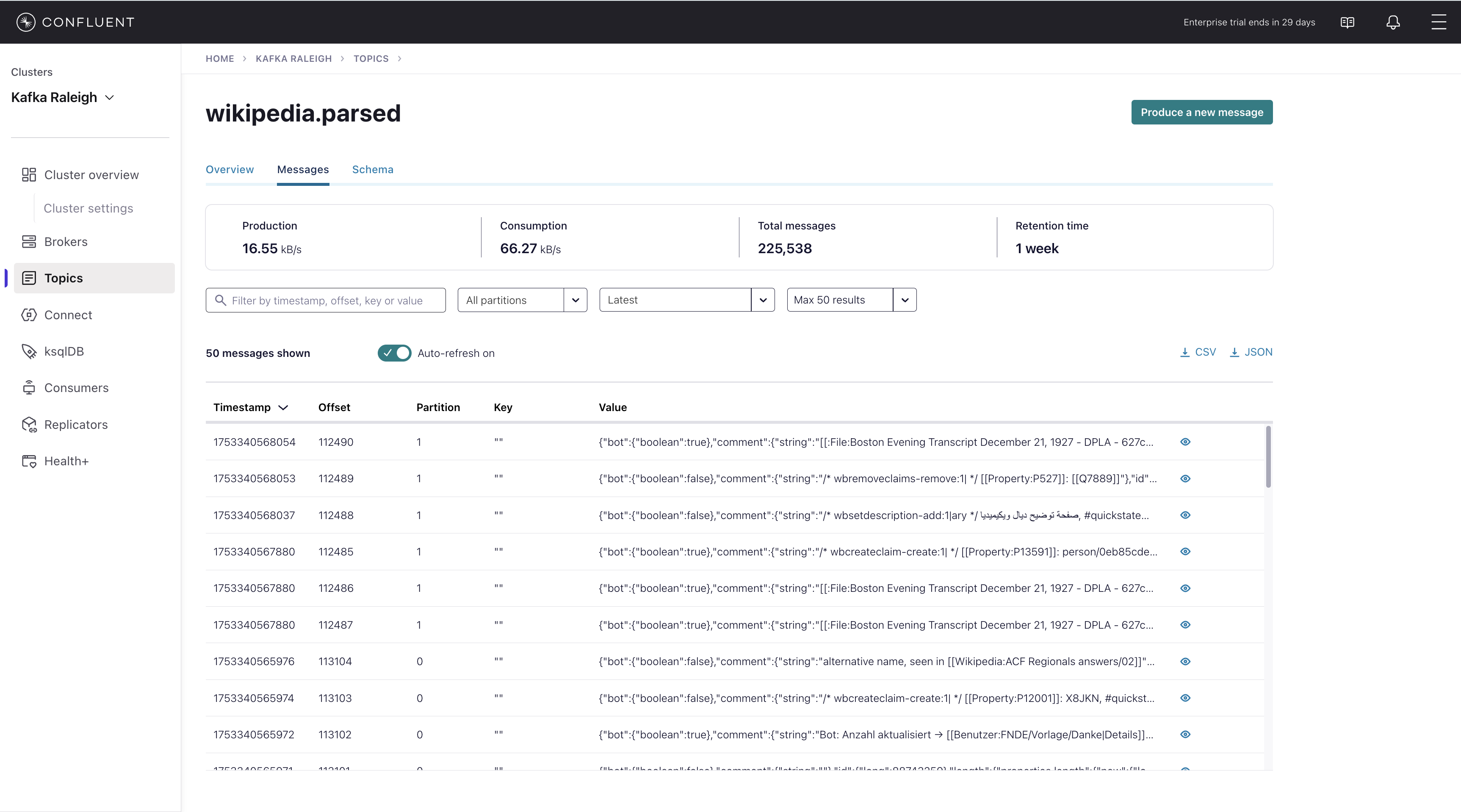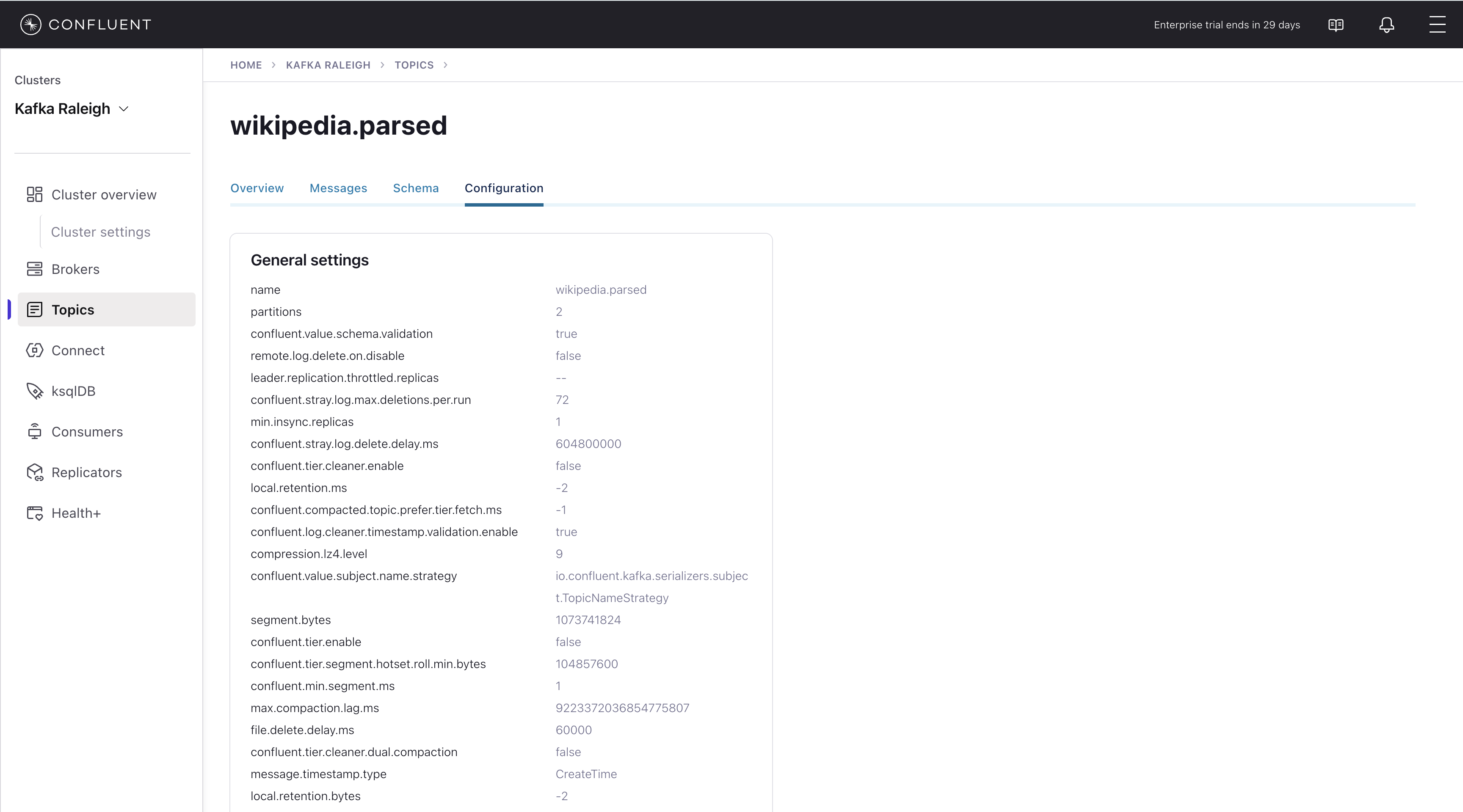 wikipedia.parsed, the topic value is using a Schema registered with Schema Registry (the topic key is just a string).