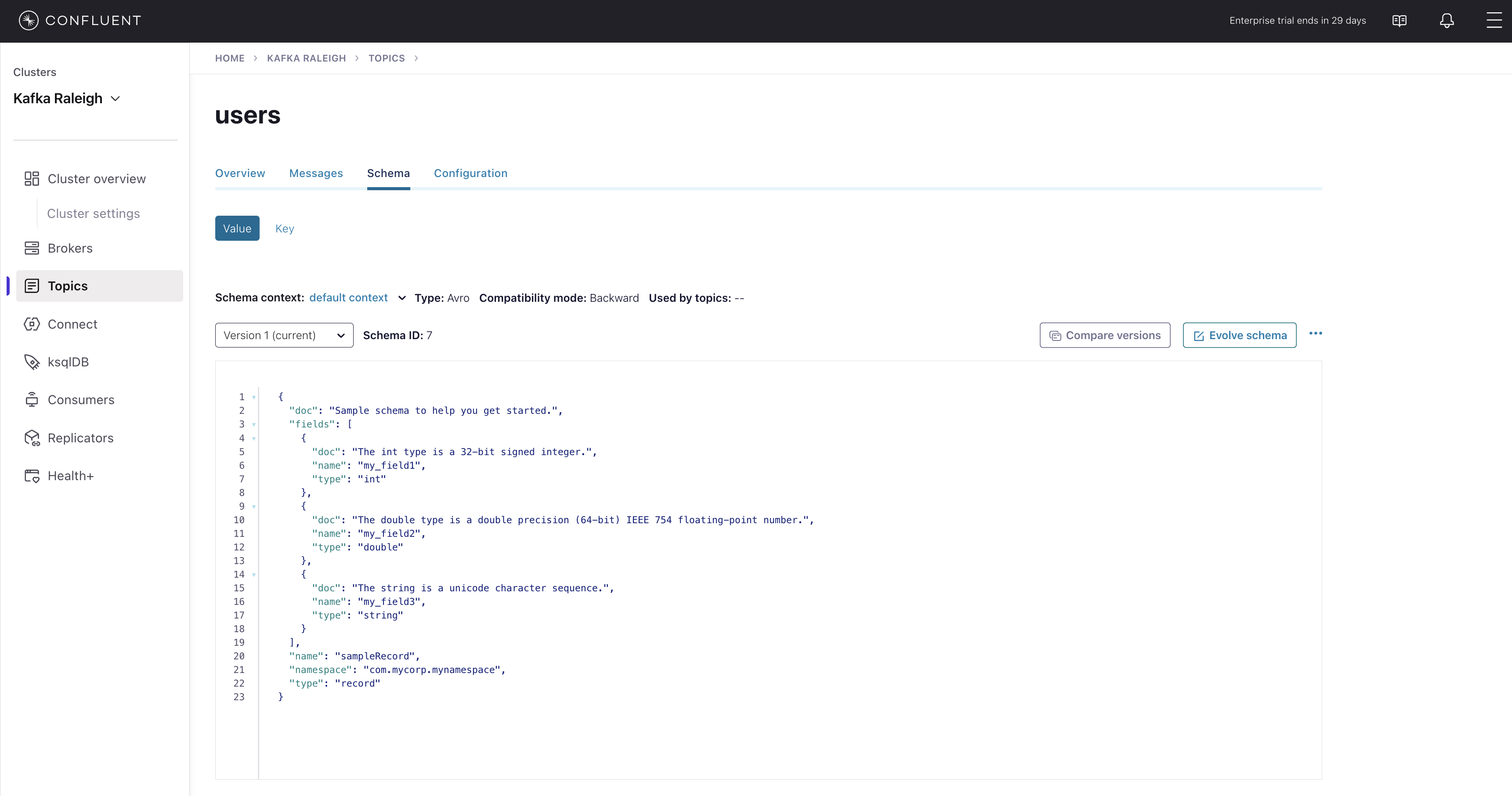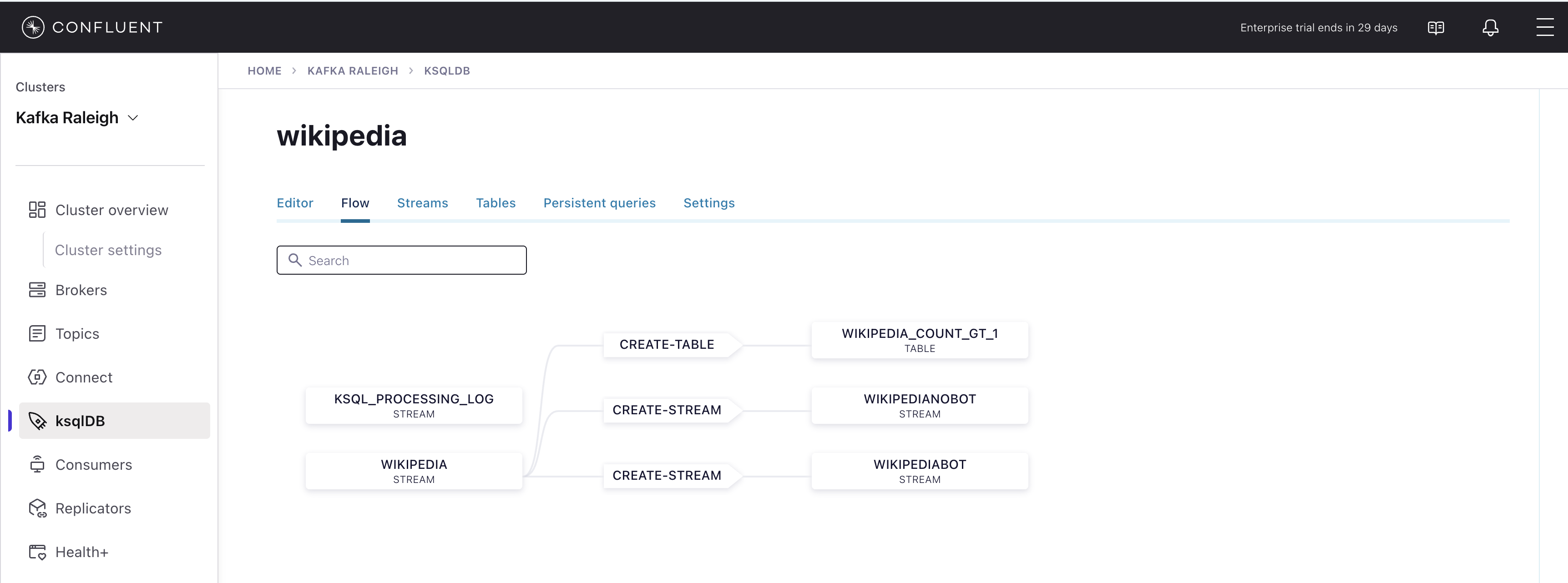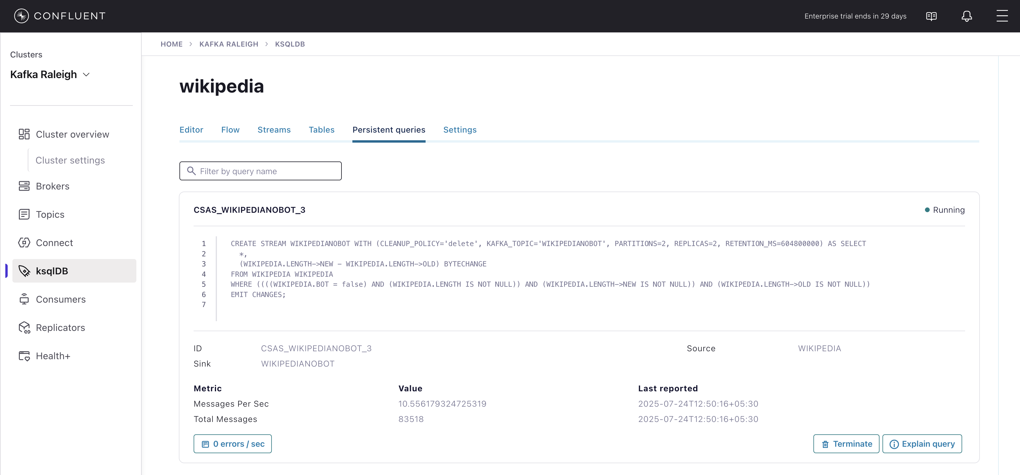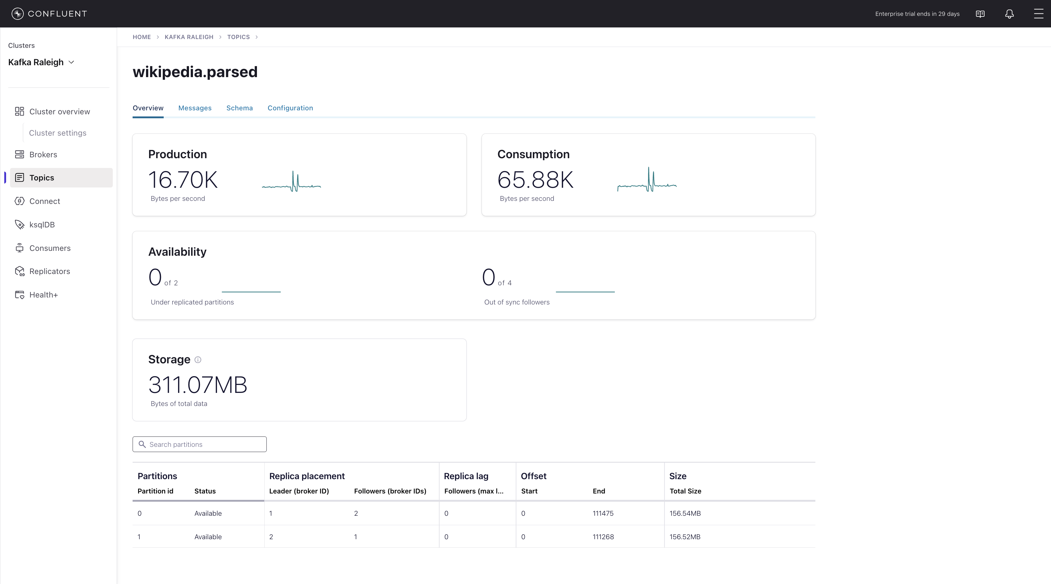 wikipedia.parsed, the topic value is using a Schema registered with Schema Registry (the topic key is just a string).