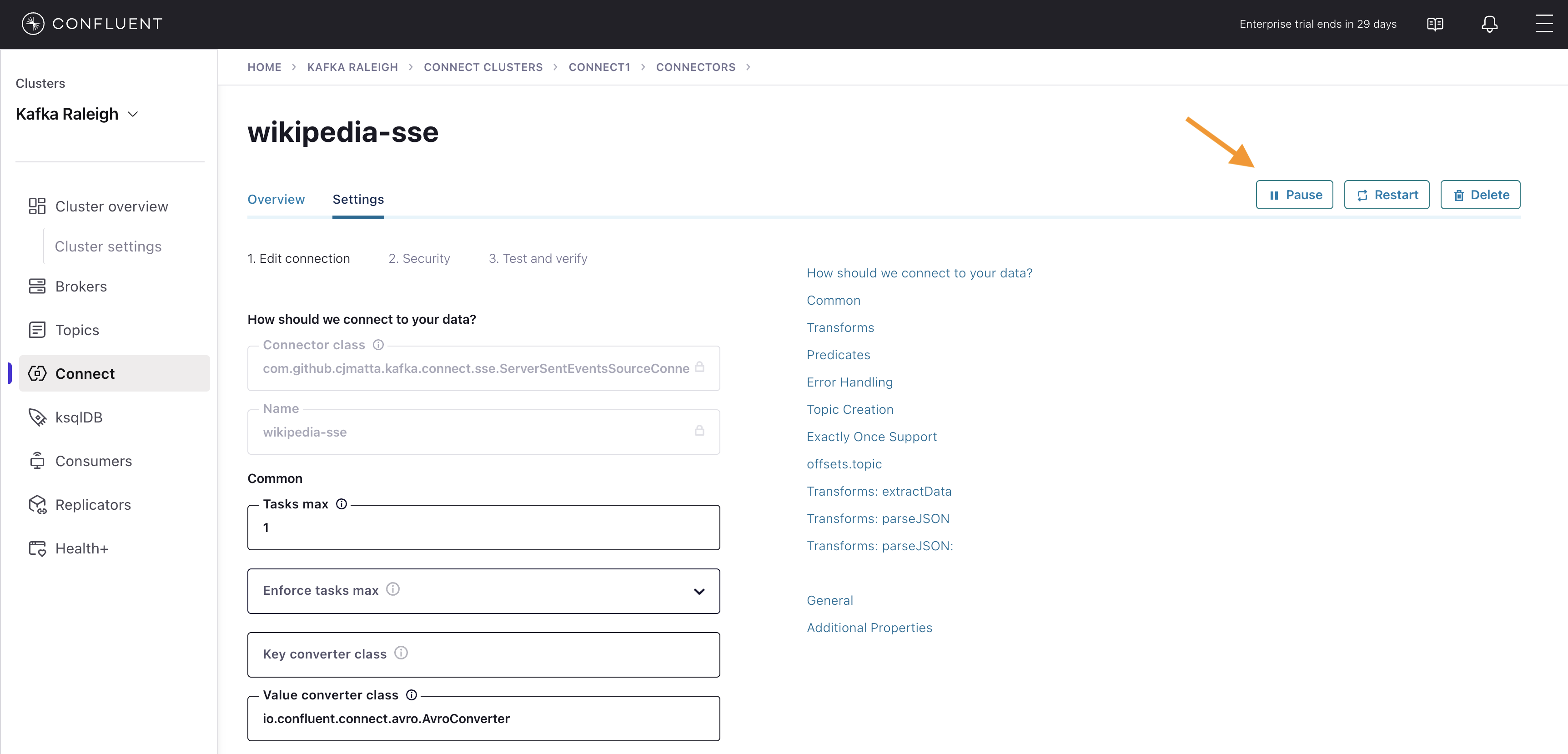 Click any connector name to view or modify any details of the connector configuration and custom transforms.