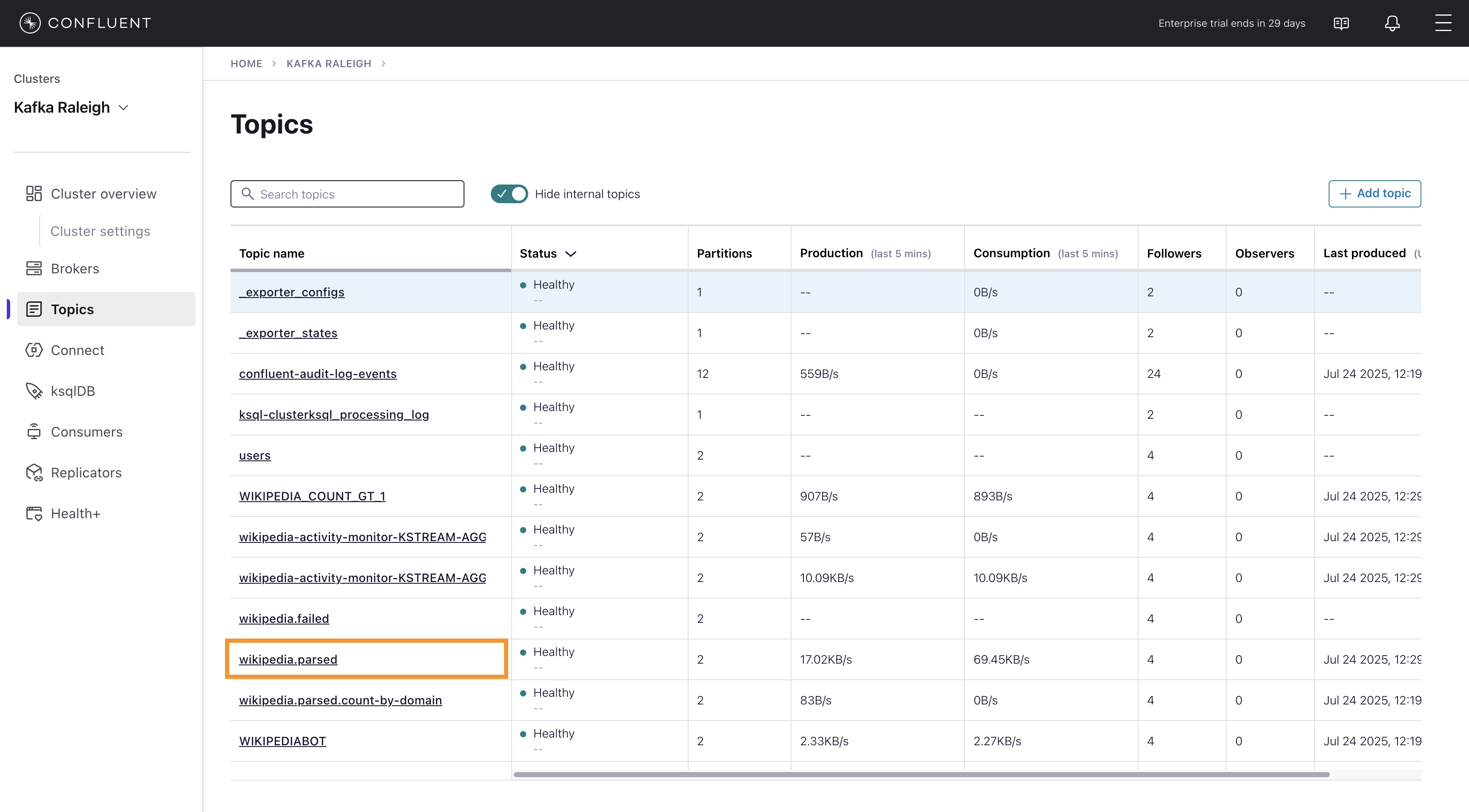 dev_userscreated in the previous step."_confluent-monitoring" "dev_users" "users" "wikipedia-activity-monitor-KSTREAM-AGGREGATE-STATE-STORE-0000000003-changelog" "wikipedia-activity-monitor-KSTREAM-AGGREGATE-STATE-STORE-0000000003-repartition" "wikipedia.failed" "wikipedia.parsed" "wikipedia.parsed.count-by-domain" "wikipedia.parsed.replica"